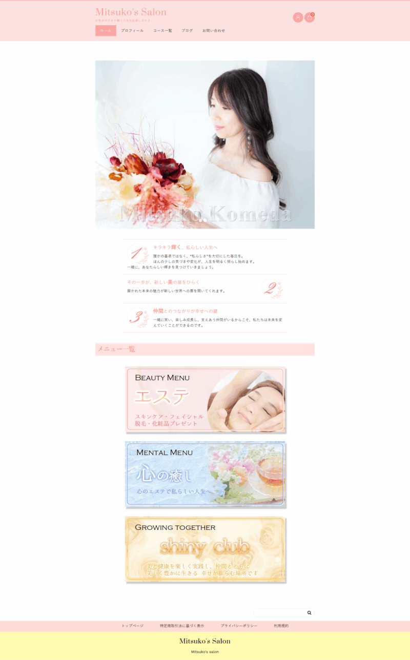 このたび、エステサロン「LIANGE PEPE」と女性のためのコミュニティ「Shiny Club」を主宰されている、みつこさんのホームページを制作させていただきました。